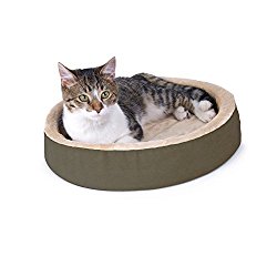 The K&H Thermo-Kitty Heated Cat Bed comes in two sizes (16 inch and 20 inch round) with 6 inch high walls. It uses a dual-thermostat unit that will raise the temperature 15 degrees above the ambient room temperature when not in use. When your cat is on the Thermo-Kitty heated cat bed it will heat to your cat’s normal body temperature. Buy yours here